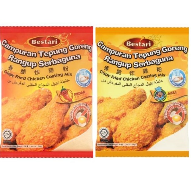 Packed Food 4Flour. Bestari Tepung Goreng Ranggup Serbaguna Fried Chicken. 1KG BESTARI CAPURAN TEPUNG GORENG RANGGUP SERBAGUNA BESTARI TEPUNG GORENG AYAM FRIED CHICKEN COATING MIX 香脆炸鸡粉 FAVOR PEDAS FAVOR ORI IMPORTANT NOTICE We strictly DO NOT sell expired goods Any quantity order do let us know We DO RESTOCK every week bestari brand cap bestari tepung goreng ayam friend chicken coating mix flour.