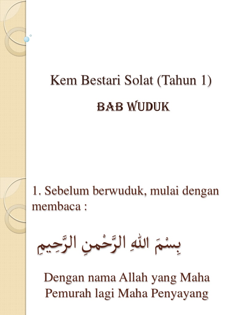 Ajarkan anak-anak kamu solat seawal usia mereka 7 tahun Riwayat Tarmizi Buku Kem Bestari Solat TAHAP 1. Insyallah berkat kesempurnaan wuduk yang kita laukan akan membersihkan hati seterusnya menzahirkan wajah yang tenang dan tingkahlaku yang ikhlas mengharapkan keredhaan Allah SWT. Apakah yang dimaksudkan dengan wuduk.